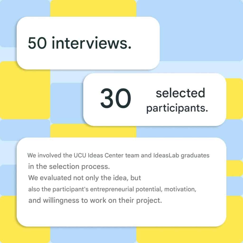Together with the team of Ideas Center UCU and graduates of IdeasLab, we conducted 50 interviews to choose the 30 most motivated participants from all over Ukraine.